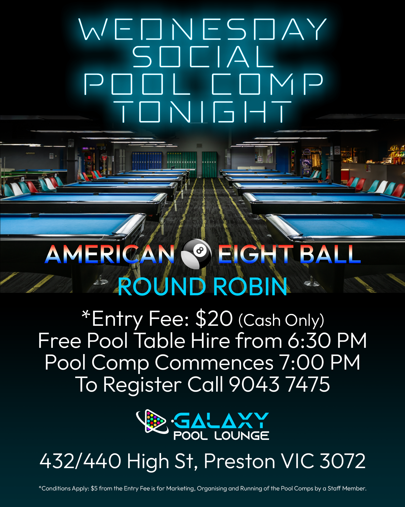 Call Galaxy Pool Lounge on (03) 9043 7475 or walk-in and see staff on the night.